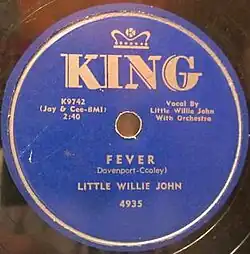 The idea for "Fever" was presented to Otis Blackwell by an old friend, Eddie Cooley, who had a hit song called "Priscilla" in 1956.[2] Blackwell said: "Eddie Cooley was a friend of mine from New York and he called me up and said 'Man, I got an idea for a song called 'Fever', but I can't finish it.' I had to write it under another name because, at that time, I was still under contract to Joe Davis." John Davenport, the name he used, was the name of Blackwell's stepfather.[3] Little Willie John reportedly disliked the song, but was persuaded to record it, on March 1, 1956, by King Records owner Syd Nathan and arranger and producer Henry Glover.[4] It became the title track for his debut album, Fever, released in 1956.[5] "Fever" is a soul and rhythm and blues minor key opus with an arrangement consisting of low saxophones played by Ray Felder and Rufus "Nose" Gore and guitar by Bill Jennings. The vocal style of Willie John is similar to moaning and he is backed by finger snaps. Bill Dahl from the website AllMusic noted a contrast between the song's "ominous" arrangement and the vocals along with the finger snapping which "marginally lightened the mood".[2]