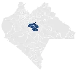 Under the 2023 districting plan adopted by the National Electoral Institute (INE), which is to be used for the 2024, 2027 and 2030 federal elections,[6] Chiapas's 5th district covers 138 electoral precincts (secciones electorales) across five municipalities in the central region of the state:[7][8]