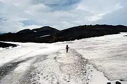 Fimmvörðuháls (Icelandic pronunciation: [ˈfɪmːˌvœrðʏˌhauls] ⓘ; "five cairns pass") is the area between the glaciers Eyjafjallajökull and Mýrdalsjökull in southern Iceland. The route between Skógar and Thórsmörk goes through this pass and is one of the most popular walking routes in Iceland, despite being 22 kilometres (14 mi) long and involving 1,000 metres (3,300 ft) of climbing. There are two mountain huts along Fimmvörðuháls, one owned by hiking association Útivist, the other called Baldvinsskáli ([ˈpaltˌvɪnsˌskauːlɪ]). The route from Skógar has many waterfalls along the way. The route is only accessible between mid-June and late-August. On the night of 16 May 1970, three travellers died in the mountain pass in a snowstorm.