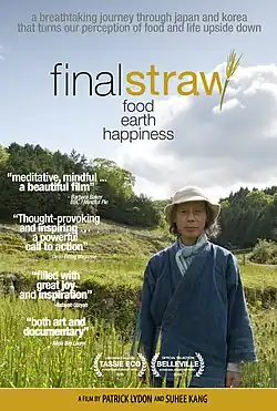 Final Straw: Food, Earth, Happiness is a documentary/art film released in June 2015 that takes audiences through farms and urban landscapes in Japan, South Korea, and the United States, interviewing leading practitioners in the natural farming movement.[1] The film—inspired by the work of Masanobu Fukuoka, and his book The One Straw Revolution—came about when an environmental artist (Patrick M. Lydon) and an environmental book editor (Suhee Kang) had a chance meeting in Seoul, South Korea, and began conducting short interviews together with leaders in the ecology and social justice movements.[2] During an interview with Korean farmer Seong Hyun Choi, the two were so impressed by his ecological mindset and way of working that they set out to produce a feature film about the wider natural farming movement in Japan and Korea. Lydon and Kang ended up quitting their jobs, giving away most of their possessions, and becoming voluntarily homeless for four years in order to afford producing the film.[3][4][5]