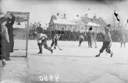 The first international bandy game after Finland became independent was held during the 1919 Finnish Winter Games in Helsinki, which were the first international sporting event organized by the recently independent nation.[4] The national team's roster was dominated by players from Viipurin Sudet and included only three players representing other domestic clubs, Harald Nyström from HIFK, Lars Schybergson from Kiffen, and Niilo Tammisalo from HJK. The national team's match against the Swedish club IFK Uppsala was held on 23 February at Töölön Pallokenttä before a crowd of 5,000 spectators, including State Regent of Finland C.G.E. Mannerheim.[3] The Finns won the match 4–1 in a victory that was described in the press as “one of the most amazing achievements of Finnish athletes.” [5]