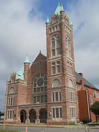 First Baptist Church is a historic African-American Baptist church located in Norfolk, Virginia. It was designed by architect R. H. Hunt and dedicated in 1906. It is a Romanesque Revival-style church with a richly ornamented facade of rough-faced, pink granite ashlar and limestone trim. It features a tall, eight-level corner tower with a multiplicity of window types and a shorter flanking tower at the opposite corner.[3] Construction began in 1904.[4]