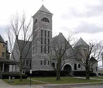 First Presbyterian Church Complex is a historic Presbyterian church located at Gouverneur, St. Lawrence County, New York. The complex consists of the Romanesque Revival style church (1892-1893) and Queen Anne style manse (1904). The church has a modified cruciform plan with a cross-gable roof and constructed of both roughhewn and smoothly dressed Gouverneur marble. The front facade features an entrance loggia, with unequal square towers with hipped roofs flanking it. The manse is constructed of yellow pressed brick and features a round three-story tower and verandah. The interior features Colonial Revival style design elements. The house was sold to the Gouverneur Historical Society in 1974 and houses a local history museum[2]