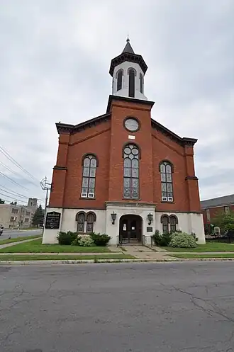 First United Methodist Church is a historic United Methodist church at Ilion in Herkimer County, New York. It consists of the original church was built between 1864 and 1866 and the attached 1890 Remington Chapel. The main block of the church consists of tall, red brick masonry walls erected above a basement of cut stone in the Italianate style. The 85 feet by 45 feet rectangular, gable roofed sanctuary features an engaged brick entrance / bell tower. The Remington Chapel features Tiffany stained glass windows installed in 1911 and 1928 in memory to members of the Remington family.[2]