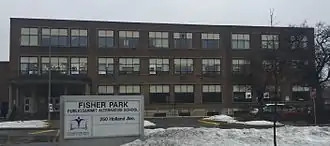Fisher Park was originally built in 1949 as the city's fifth public high school, to serve Ottawa's west end, but was closed in 1987 in a controversial decision by the Ottawa school board.[6] The school was reopened in September 1994 as a middle school, feeding students into Nepean High School and Glebe Collegiate Institute.