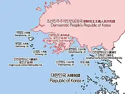 The Five West Sea Islands (also called the Five Islands of the West Sea or the Northwest Islands) (Korean서해오도; Hanja西海五島) refers to the five islands in the West Sea (Yellow Sea) administered by Incheon, South Korea. They are Yeonpyeongdo, Baengnyeongdo, Daecheongdo, Socheongdo and Soyeonpyeongdo. Their positions are much closer to North Korea as these islands are originally part of Hwanghae Province and their sovereignties are claimed by North Korea,[1] but they are controlled by South Korea since the United Nations forces established the Northern Limit Line (NLL) north of the islands in 1953 following the Korean War.[2]