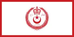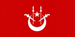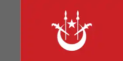 DesignA red field defaced with a white crescent and star and two white kris and spears.