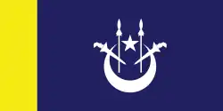 Flag of the Bendahara A blue flag with a yellow hoist, with a white crescent and star and two white kris and spears charged on the fly.
