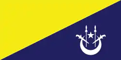 Flag of the Head of Royal Ceremonies A yellow-blue per bend divided flag with a white crescent and star and two white kris and spears in the bottom right.