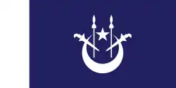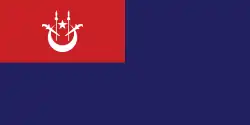 State and war ensign A blue field with a white crescent and star and two white kris and spears in a red canton.
