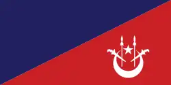 Flag of the Private Secretary to the Sultan A blue-red per bend divided flag with a white crescent and star and two white kris and spears in the bottom right.