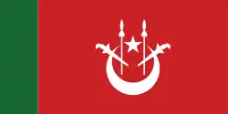 Flag of the State Secretary A red flag with a green hoist, with a white crescent and star and two white kris and spears charged on the fly.