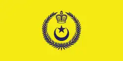 present Royal standard of the Raja Perempuan A yellow flag with the royal arms in blue charged on the centre.