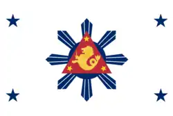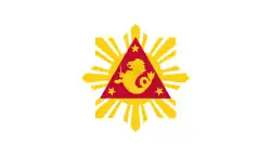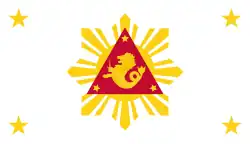 After President Elpidio Quirino amended Roxas's order under Executive Order No. 457 (s. 1951), he changed the design of the coat of arms, and ordered that it will be identical to the president's, but without the ring of stars.[1] This version of the flag was used until 1972 when the office was abolished by martial law and subsequently excluded from the original text of the 1973 Constitution.