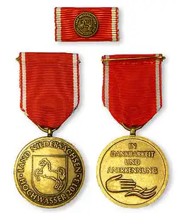 The Flood-Medal 2013 of the State of Lower Saxony (German: Hochwassermedaille 2013 des Landes Niedersachsen) was donated in 2013 as federal award by the government of the State of Lower Saxony to honour the help of the numerous relief units and volunteer helpers during the 2013 European Floods who did their duty in the State of Lower Saxony. Helpers and members of the relief units, who did their duty in the beginning of June 2013 in Lower Saxony, where hereby honoured for their engagement.