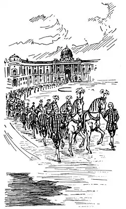 According to Salten's biographer Beverley Driver Eddy, "the portrayals of royalty are as compelling as those of the animals".[7] As a journalist, Salten was famous for his sketches, portrayals and obituaries of celebrities, which were also collected in books: Buch der Könige (1905) and Das österreichische Antlitz (1909).[8] In Florian, the text sometimes turns into "a history lecture"[9] about the Heir Apparent, Franz Ferdinand, who receives special attention: he is shown coarse and impatient to ascend to the throne, and the antagonism between him and the emperor is illustrated in detail.[7] Also the visiting monarchs Edward VII of England and Nicholas II of Russia are depicted in a lively way.