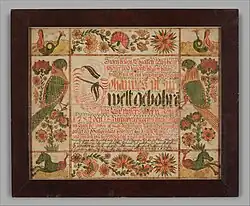 Fraktur art was a decorative illumination element for documents such as poems, religious texts, birth and baptismal certificates, and furniture.[11] It was primarily practiced in Pennsylvania by the Pennsylvania Dutch, and was named after the fraktur script it commonly accompanied. Artists typically used a goose quill as a primary tool to outline and draw onto their mediums while using a brush made from cat hair to put the colors down.[4] Fraktur art is closely related to calligraphy, not only in the similar use of tools but also in the dependence on the line to create dimension and shape within the artworks.[11] All the elements within the artwork are outlined with a black calligraphic line to enhance the dimensionality of the element by providing layered details onto the flat colors laid down, while also contrasting it against the often pale background and monochromatic text.[4] However, the lack of expressive brushwork, texture and shading resulted in an overall flatness by enhancing the two dimensionality of the artworks. The main subject matter of these fraktur artworks often consisted of birds, animals and flower motifs within a floral arrangement that encircled the text as a border.[13]