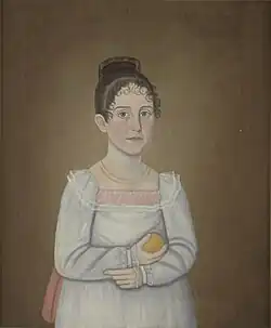Ruth Henshaw Bascom (1772–1884) was another established female folk artist. Her compositions are almost exclusively portraits, of which she produced over 1,400.[46] Portraiture became popular among women artists who would often use children and relatives in the home as models. Their art thus emphasized community and family involvement.[46] Other prominent women folk artists of the 18–19th century who specialized in portraiture include Susan Waters and Emily Eastman.