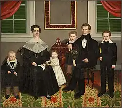 The style of American folk portraiture varied across different regions due to the diversity of immigrants.[4] However, there is some influence of academic conventions in the composition, setting and poses of the portraits.[9] There were two types of settings for portraits: a solid, monotone backdrop or the homes of the sitters often surrounded by objects that conveyed their personality, status or gender.[10] The portraits are restrained in all aspects as they are characterized by a flattened perspective with generalized lighting which created little to none tonal shading.[9] As artists distorted scale and depth, they confined their sitters to a narrow dimension of space between the picture plane and the background behind them to allow for a shorter depth of field.[10] There is an overall flatness and linearity to the paintings due to the flat, delicate application of paint across the entire artwork. The artworks are carefully composed with clear spatial arrangements for each figure within the work as the sitters are either posted in full profile, looking straight at the viewer or slightly turned to one side.[11] Folk art portraits were either bust portraits from the chest upwards or full body portraits with static poses as artists often relied on compositional formulas for the face and hands which provided a resemblance to all the sitters which allowed artists to work quickly with limited materials and time.[10] This resulted in the lack of emotion depicted through the stern expressions, direct gazes and tight pursed lips.[12] Motifs and objects were used instead as an identifying mark for the patrons with books and eventually newspapers were a common traditional motif in male portraits, while female portraits contained symbols of femininity and domesticity such as fruits, flowers, animals or handheld fans.[10] The texture and patterns of the sitters' clothes, furniture or carpets allowed artists to enliven the already sombre portraits and evoke the personality of the sitters.[12]
