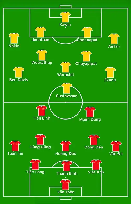 In the following minutes, Vietnam continued to maintain pressure with high balls and took advantage of striker Tien Linh's physique. In the 18th minute, from a cross from the right wing, Tien Linh jumped high to head the ball but the shot went right to the position that veteran goalkeeper Kawin Thamsatchanan had chosen, causing the scoring opportunity to be missed.[3] Then, in the 23rd minute, Tien Linh tried his luck with a long-range shot from more than 30 meters away, but the ball was inaccurate and did not pose a threat to the Thailand goal. On the Thai side, this team organized a number of dangerous combinations. Notably, in the 36th minute, Ben Davies skillfully dribbled past the Vietnam defense and then made a pass inside. However, center-back Thanh Binh intervened in time to prevent a situation that could have led to a goal. In the 43rd minute, Thailand continued to create dangerous opportunities from a corner kick by Weerathep Pomphan. Although the ball was accurately hung into the penalty area, center-back Jonathan Khemdee, who was of Thai-Danish descent, was not in a favorable position to shoot. Before the end of the first half, Vietnam had another notable opportunity. In the 45th minute, from a quick counter-attack, defender Lê Văn Đô made a cross across Kawin's goal, but no home team player was able to get in to finish.[3]