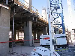 Formwork tables in use at a building site with more complicated structural features