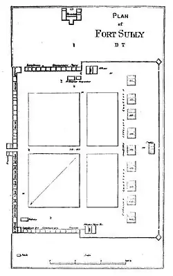 For officers' quarters there are nine detached frame buildings, built of pine, on brick foundations, with collars underneath. Each set has a back building of one story, as a kitchen. All the rooms are lathed and plastered. Three of the houses are one and a half stories high, and contain each four rooms, a hall, store-room, and pantry. Two cottages are of one story, while two others, of one and a half stories, are divided each into two sets of quarters of four rooms. None of these quarters have bath-rooms. The guard and prison-rooms are in the ends of the barrack building next the sally-port. The prisoners' room is 15 by 15 feet (4.6 m). The quartermaster's store-houses, two in number, measure 230 by 22 feet (6.7 m) and 120 by 24 feet (7.3 m). The commissary's store-houses, also two in number, measure 228 by 17 feet (5.2 m) and 50 by 22 feet (6.7 m).[9]