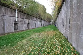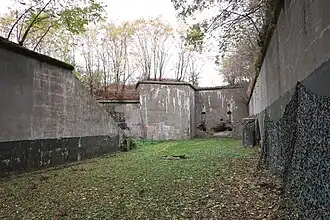 The Brialmont forts were designed to be protected from shellfire equaling their heaviest guns: 21 cm.[4] The top of the central massif used 4 metres (13 ft) of unreinforced concrete, while the caserne walls, judged to be less exposed, used 1.5 metres (4.9 ft).[5] Under fire, the forts were damaged by 21 cm fire and could not withstand heavier artillery.[6]