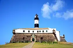The Barra Lighthouse (Portuguese: Farol da Barra), also known as the Santo Antônio Lighthouse (Portuguese: Farol de Santo Antônio), was built in the center of the fort in the 17th century. The primitive structure was replaced in 1839 by a structure built in England. It was dedicated by Dom Pedro II of Brazil. The lighthouse is a 22 metres (72 ft)-high tapered tower constructed of masonry and painted with black and white bands.[2]
