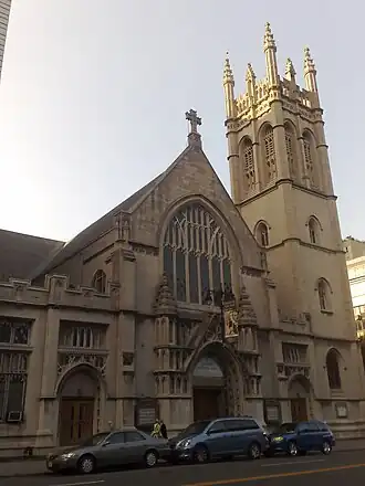 In 1898, the congregation built its current home, dubbed "the Cathedral of Universalism", at West 76th Street and Central Park West on New York City's Upper West Side. The architect, William Appleton Potter, based the design closely upon Magdalen Tower, Oxford, and buildings at Magdalen College. In 1993 Robert A. M. Stern and his co-authors described the church as "one of the few buildings to break from Central Park West's prevailing Classicism."[2][3] A rare design in English Perpendicular Gothic, it received praise from notable architects including Frank Lloyd Wright, whose daughter was married at the church. The church houses several significant artistic works, including an altar by Louis Comfort Tiffany, a bronze relief sculpture by Augustus Saint-Gaudens, a mosaic by J&R Lamb Studios, and stained glass windows by Clayton and Bell of London. The organ was donated by Andrew Carnegie and his wife, Louise Carnegie, the latter who was a member of the church.[4] Originally designed and constructed by the Hutchings-Votey Organ Company of Boston, the organ was rebuilt and revised by the Ernest M. Skinner Company.