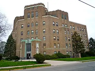 The St. Charles Hospital was built for the Sisters in 1932 for $500,000. It was designed in the Art Deco style by Wybe Jelles Van der Meer, who primarily planned ecclesiastical buildings and did most of his work for the Roman Catholic Diocese of Rockford. Construction was led by contractor C. J. DeWit, whose use of local labor during the Great Depression was lauded by the Chicago Daily Tribune. The 110-bed facility replaced the original complex as an acute care facility. Rev. Edward Francis Hoban gave the opening blessing.[1]