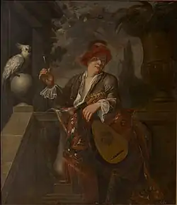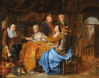 Other of his merry company paintings are believed to convey some moral message through the use of certain symbols. The Card players (Guernsey Museum & Art Gallery) depicts a scene of a company of two women and four men. Two of the men and the women are sitting around a table playing cards. The composition may be a criticism of the vice of gambling, which leads to an individual's downfall. One of the players in the composition is a soldier, who has left his sword vulnerable and unguarded. There may also be some plot afoot involving the two men not participating in the card game, possibly referring to an historic event or proverb well known at the time. There is a feeling of things getting out of hand through the discarded empty bottles and the playing cards strewn on the floor.[7]