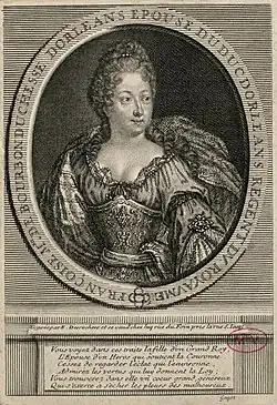 Françoise Marie de Bourbon (Légitimée de France; 4 May[2] 1677 – 1 February 1749) was the youngest illegitimate daughter of King Louis XIV of France and his maîtresse-en-titre, Françoise-Athénaïs de Rochechouart, Marquise de Montespan. At the age of 14, she married her first cousin Philippe d'Orléans, the future regent of France during the minority of Louis XV. Through two of her eight children, she became the ancestress of several of Europe's Roman Catholic monarchs of the 19th and 20th centuries—notably those of Belgium, Italy, Portugal, Spain, and France.