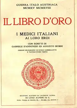 Della Valle paid attention and care, especially during and after the war, to bear witness to the activity and sacrifice of military doctors, career and complementary officers, and health assistants who died, were wounded and disabled in the war, including diseases contracted during military service. In the years following the end of the war, he was also the president of the Committee for the celebration of doctors who died in the war; in this position, Della Valle promoted and followed, entrusting the coordination to the Medical Captain Federico Bocchetti – a two-year project for the collection of documents and testimonies, which in 1924 resulted in the publication of the 'Libro d'oro. I medici italiani ai loro eroi'.[17]