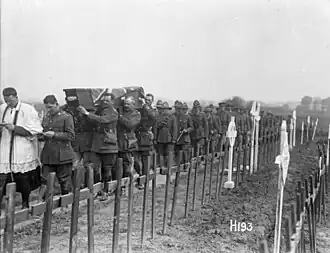 The coffin of Brigadier General Francis Earl Johnston, carried by fellow brigadier-generals, leads the funeral procession, 18 August 1917