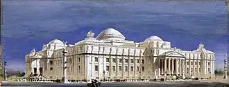 On returning to the United States, Hoppin joined the firm of McKim, Mead and White in 1886. Reportedly, while with the firm, McKim noted Hoppin's exceptional skill at rendering with one architectural historian writing: "Among architects that had a facility for perspective Francis L.V. Hoppin stands out..." He became the office specialist in perspective, exemplified in his drawings for the Century Club and The Brooklyn Museum. Fellow office architect, Egerton Swartwout, characterized Hoppin's drawings as "colored, blue sky and trees where there aren't any, and flying shadows on the building, you know, a real snappy piece of work."[8]