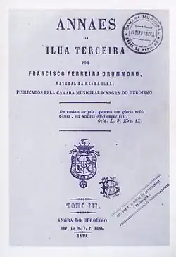 • Anais da Ilha Terceira (Annals of the island of Terceira); chronological annals of the history of the island of Terceira (1850), and presented by the Câmara Municipal of Angra do Heroísmo. The work contains four volumes, containing 1420 pages and 510 documented references. Volume I was first published in 1850, the second volume in 1856, the third volume in 1859 and the fourth, posthumously in 1864. The work was photocopied and republished in 1981, by the Secretaria Regional da Educação e Cultura (Regional Secretariate for Education and Sciences)