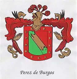 The lineage of the Pérez de Burgos family possibly has its origin in Garci Perez de Burgos or Ferrán Pérez de Burgos, a Spanish nobleman from Burgos, who participated in the Conquista of Jerez de la Frontera,[22] and who served as vassal of the Kings of Castile.[23]