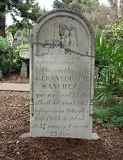 He also served as the leader of the failed Mexican military response to the June 14, 1846 California Republic insurrection which established United States control of Mexican California. Sánchez is buried at the Mission Dolores in San Francisco.