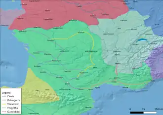 The threat of an invasion by the Eastern Roman army meant that Theodoric could not interfere in the battle.[15] The raid actually took place in early 508 in the boot of Italy, but the Roman intervention was not aimed at conquest. It did not seek confrontation with Theodoric's army and limited itself only to the conquest and plundering of cities in the south.[16] Only when Theodoric had the situation under control, he sent an army to the south to assist the Visigoths.