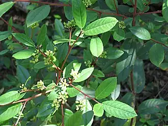 The branches may have a reddish tinge and the new twigs are often red in color. The alternately arranged leaves are evergreen and glabrous or smooth without hair above; there is normally a waxy-white undercoating on the bottom.[8] The blades are an ovate to elliptic shape, thin in moist habitat, and smaller and thicker in dry areas.[8] The leaves are fully developed around May.[9]