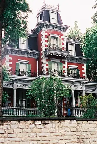 Cattle baron and banker Frank Bloom and his wife Sarah had the mansion created in 1882. The building is constructed in a French style and used locally made bricks. The home is still decorated with an array of period furnishings including a horn chair and delicate porcelain figures.[2]