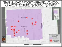 The Frank Lloyd Wright Historic District's boundaries for its National Register listing is roughly the Oak Park roads of Clyde Street, Division Street, Lake Street and a combination of Harlem Avenue.[1] The district's local boundaries are irregular but more specifically it is bounded by Division Street on its north, Lake Street on its south, Ridgeland Avenue on its east, and Marion Street and Woodbine Avenue on its west.[4]