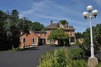 The Franklin Fairbanks House stands west of downtown St. Johnsbury, on the south side of Western Avenue (United States Route 2), between the Fairbanks Inn and the St. Johnsbury School. It is a 2+12-story wood-frame structure, with a hip roof, clapboarded exterior, and brick foundation. It has a basic T-shaped layout, with gabled projections to both sides, with its main facade oriented facing east. It has high-style Italianate decorative features, including roof dormers with finials, a bracketed cornice, polygonal window bays, and a porch with chamfered posts. A carriage barn is attached at the southern end.[2]