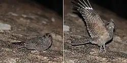 The freckled nightjar is a large, powerfully-build species of nightjar with long wings and relatively short tails. They lack any prominent markings and appear dark gray or nearly black from a distance. At closer range, white, cinnamon, and pale buff freckling is visible on the upperparts of adults. Their underparts are typically dark brown with a whitish and cinnamon barring pattern. Their plumage provides excellent camouflage for rocky surfaces.