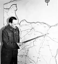In February 1942, Dorman-Smith, by this time Deputy Chief of the General Staff (DCGS) at GHQ, recommended de Guingand for the vacant post of Director of Military Intelligence, Middle East, with the rank of brigadier.[34][35][36] The appointment of de Guingand, an officer with no experience in intelligence, said much about the state of intelligence in the British Army at the time, where it was assumed that staff college training and a good brain were all that was required.[37] Nonetheless, de Guingand ultimately proved to be very successful in this role.[38] He selected two promising young officers at GHQ, Captain Bill Williams and Major James Ewart, to serve on his staff.[39] Ewart could speak German fluently and Williams, as a trained historian, was accustomed to drawing information from disparate sources together to produce a larger picture.[40] According to de Guingand, "Ewart and Williams were an ideal combination. They understood each other perfectly. Both had first-class brains, both were university dons and hated soldiering as a profession!"[41]