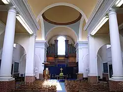 The church has a low concrete dome, by contrast to the spire of St Jude's. The interior features Tuscan columns with brick plinths, and a barrel vault. The interior is in pastel colours.[2] The church has two war memorial panels designed by Percy Delf Smith.[4]