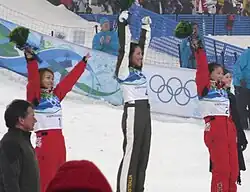 ![]() Flower ceremony for the winners of the Women's Aerials. From left: Li Nina (silver), Lydia Lassila (gold) and Guo Xinxin (bronze) | |||||||||||||