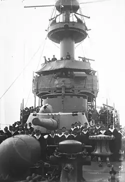After a reorganization that saw the Mediterranean Squadron redesignated as the 1st Squadron (1re Escadre), Gloire and her sisters Condé and Marseillaise were assigned to the 2nd Light Division (2e Division légère (DL)) of the 1st Squadron by June 1910. As more modern armored cruisers entered service, they were concentrated in the Mediterranean and Gloire (now the divisional flagship), Amiral Aube and Condé were reunited by January 1911 in the Cruiser Division of the 2nd Squadron, as the Northern Squadron had been redesignated.[13] In March the sisters visited New York City.[14] When the Danton-class battleships began entering service in August, the French Navy reorganized yet again with the 2nd Squadron renumbered as the 3rd and the Cruiser Division was renamed as the 3rd DL by 4 September. Gloire was now the flagship of Rear Admiral Charles-Eugène Favereau. The ship participated in the fleet review by the President of France, Armand Fallières, off Toulon that day. While conducting gunnery training on 20 September, a propellant charge exploded prematurely in one of her 194 mm gun turrets that killed nine and badly wounded another five crewmen. A memorial for the dead was conducted aboard the cruiser five days later. After the Agadir Crisis of 1911, the French and British governments agreed in 1912 that the Royal Navy would defend the northern French coast and the French would concentrate their fleet in the Mediterranean and defend British interests there. The French forces left in the north were consolidated into the 2nd Light Squadron with the 3rd DL redesignated as the 1st Cruiser Squadron. The ship was reassigned to the Atlantic Training Division (Division d'instruction de l'Atlantique) by 10 November 1913 where she served as the flagship of Rear Admiral Auguste-Georges Bouxin.[15]