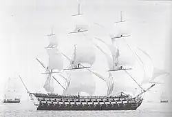 Bretagne was a large 110-gun three-decker French ship of the line, built at Brest, which became famous as the flagship of the Brest Fleet during the American War of Independence. She was funded by a don des vaisseaux grant by the Estates of Brittany.[2] She was active in the European theatres of the Anglo-French War and of the French Revolutionary Wars, notably taking an important role in the Glorious First of June. Later, she took part in the Croisière du Grand Hiver and was broken up.[4]