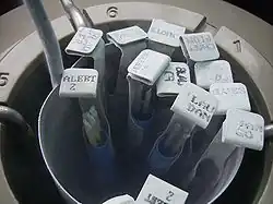 Ampules of frozen bovine semen in liquid nitrogen canister